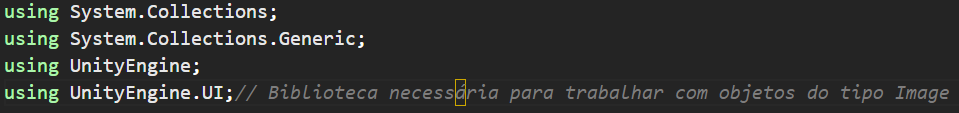 • UnityEngine.UI: Inclui componentes de UI, como Image, que são usados para a representação gráfica de elementos na interface.