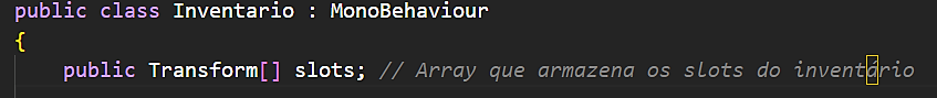 • slots: Um array de Transform que armazena referências aos slots do inventário. Cada slot é representado por um Transform, o que permite que novos itens sejam instanciados dentro desses slots.