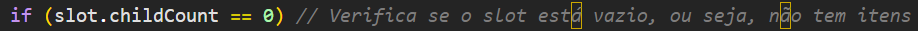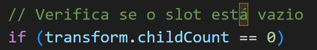 Verifica se o slot está vazio. A propriedade childCount retorna o número de objetos filhos que o slot tem. Se for igual a 0, significa que o slot está vazio e, portanto, pode receber um novo item.