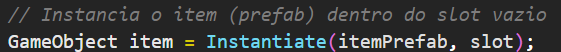 Se o slot estiver vazio, o método Instantiate é chamado para criar uma instância do itemPrefab dentro desse slot. Isso cria uma cópia do prefab e a coloca como filha do Transform do slot, ou seja, o item será posicionado dentro do slot na hierarquia da UI.