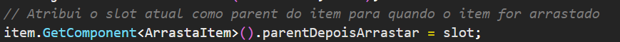 Após instanciar o item no slot, o script acessa o componente ArrastaItem (que controla o arrastar e soltar do item) e define o parentDepoisArrastar como o slot atual. Isso garante que, caso o item seja arrastado e solto novamente, ele saiba qual era o seu slot original.