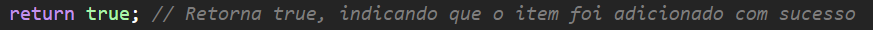 Quando o item é adicionado com sucesso a um slot, o método retorna true, indicando que o processo foi concluído sem problemas.