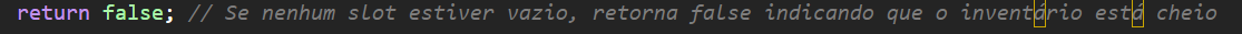 4. Se todos os slots estiverem ocupados, ele retorna false, indicando que o inventário está cheio.
