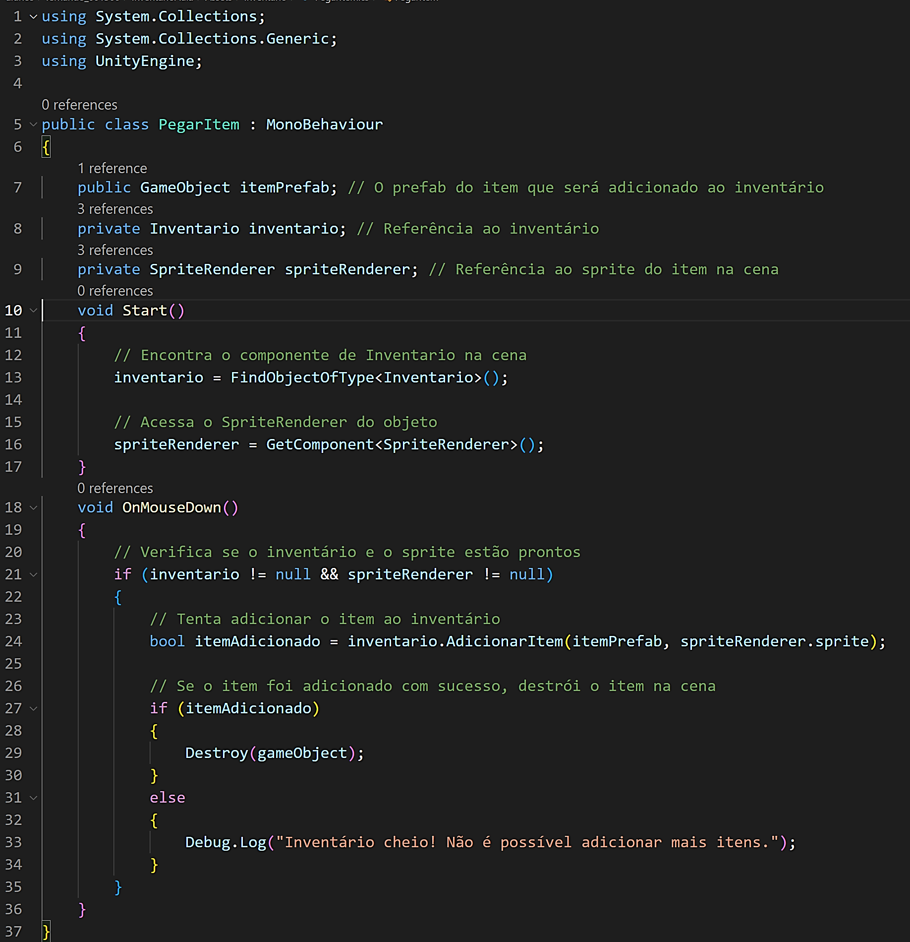 • O script busca referências ao inventário (Inventario) e ao sprite (SpriteRenderer) do item.