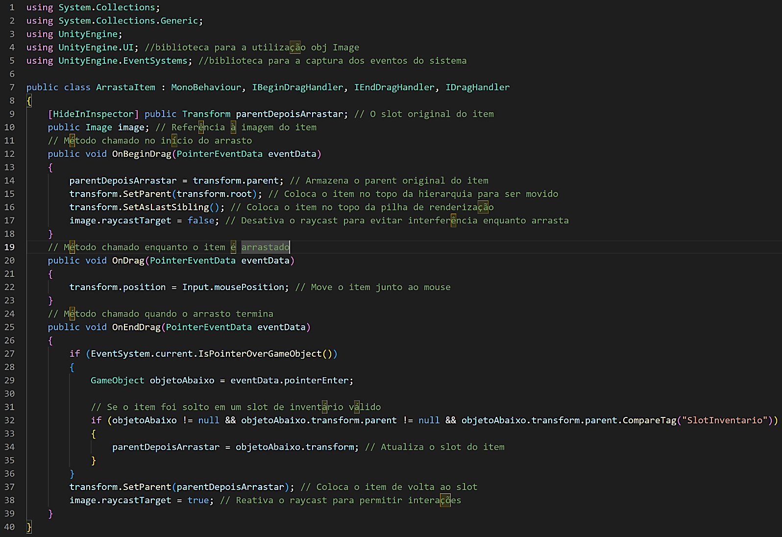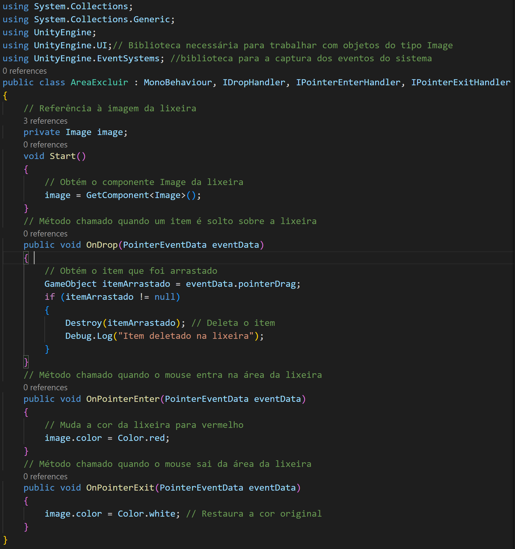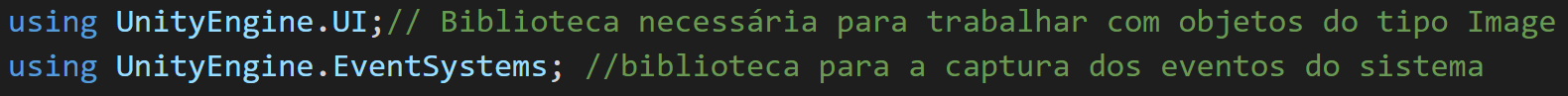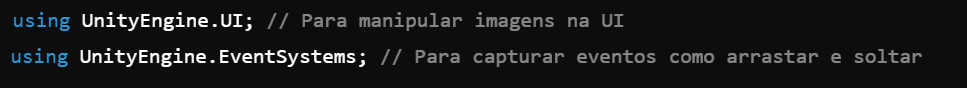 • UnityEngine.EventSystems: Essa biblioteca é necessária para trabalhar com os eventos de interface de usuário, como quando um objeto é arrastado e solto (IDropHandler) ou quando o ponteiro do mouse entra ou sai de uma área (IPointerEnterHandler e IPointerExitHandler).