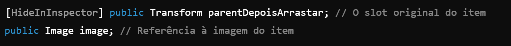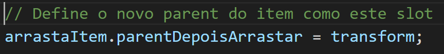 parentDepoisArrastar: Esse campo em ArrastaItem define onde o item será “anexado” após o arrasto. Aqui, o código define o parentDepoisArrastar como o transform do slot atual (que está recebendo o item).