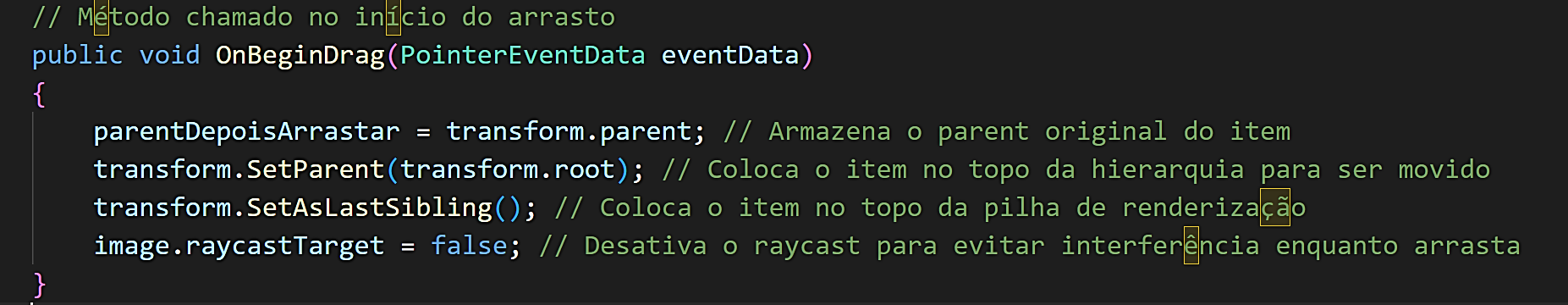 Desativa temporariamente o raycastTarget, o que significa que o item não detectará interações de clique enquanto está sendo arrastado. Isso evita que o item bloqueie a detecção de outros eventos, como o “drop” em um slot válido.