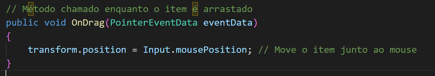 • Enquanto o item está sendo arrastado, sua posição é atualizada para seguir a posição do mouse. Isso permite que o jogador arraste o item pela tela livremente. O método Input.mousePosition captura a posição do cursor na tela.