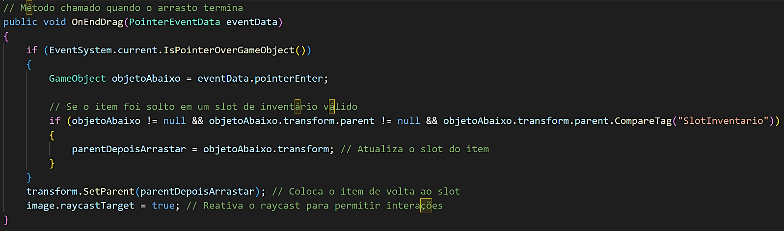 Esta linha verifica se o item foi solto sobre um slot de inventário. Se o objeto abaixo do ponteiro tiver a tag “SlotInventario”, significa que o item foi solto em um local válido.