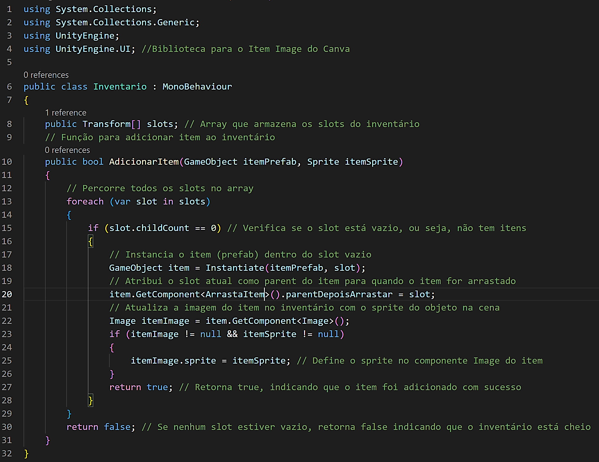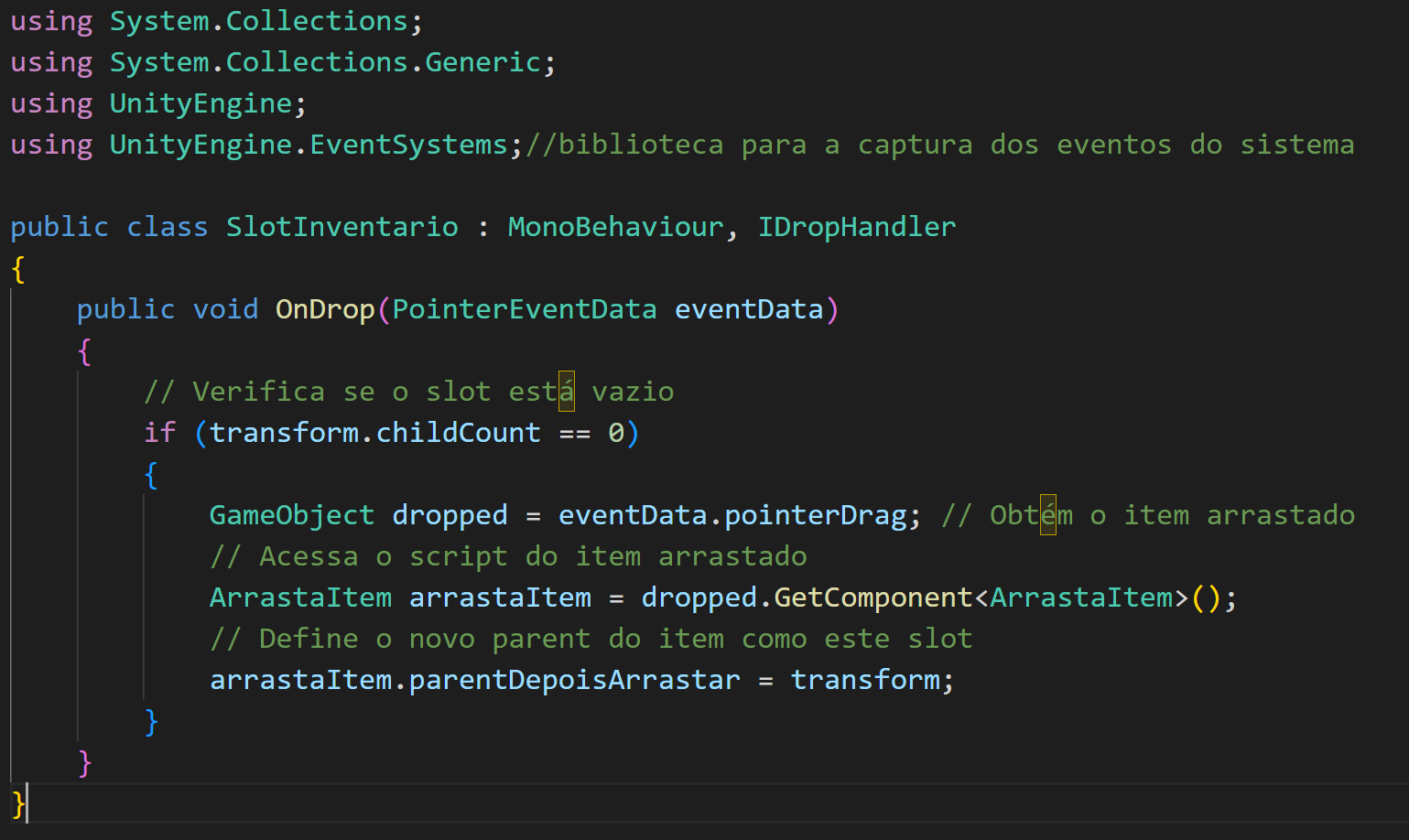 Esse script controla o comportamento dos slots do inventário, utilizando o sistema de arrastar e soltar do Unity. Ele implementa a interface IDropHandler, que permite que o slot receba notificações quando um item é “solto” sobre ele. Basicamente, o script verifica se o slot está vazio e, se estiver, ele aceita o item que foi arrastado.
