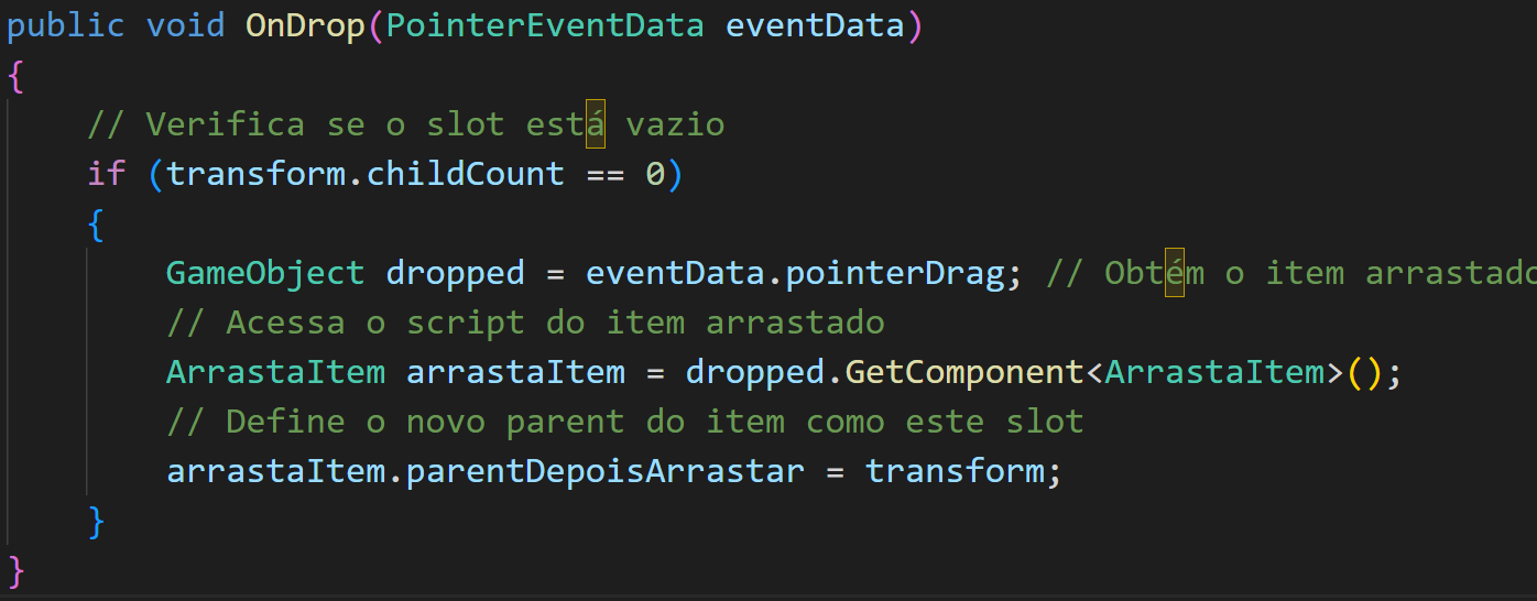 1. Receber o item arrastado: Quando o jogador solta um item sobre o slot, o método OnDrop é chamado, trazendo consigo as informações do objeto que foi arrastado.
