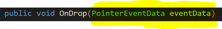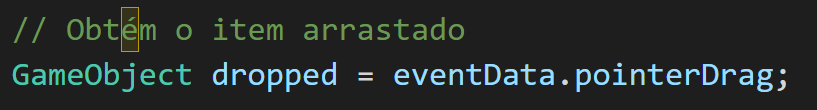 eventData.pointerDrag: O Unity mantém uma referência ao objeto que foi arrastado pelo jogador, armazenado em pointerDrag. Nesse caso, dropped é o GameObject que o jogador estava arrastando e soltou sobre o slot.