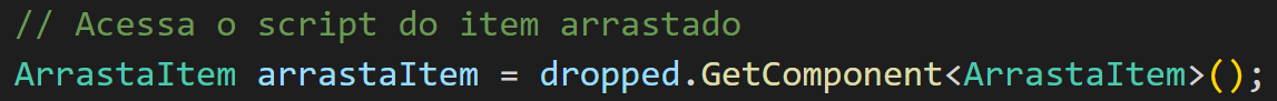 dropped.GetComponent<ArrastaItem>(): Após obter o objeto arrastado, o script tenta acessar o componente ArrastaItem, que é responsável por permitir que o item seja arrastado. Esse script contém informações importantes, como o slot original do item.