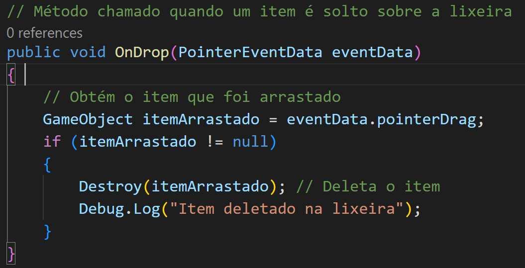 • Antes de tentar deletar o item, o script verifica se itemArrastado não é null, ou seja, se o jogador realmente soltou algo na lixeira.
