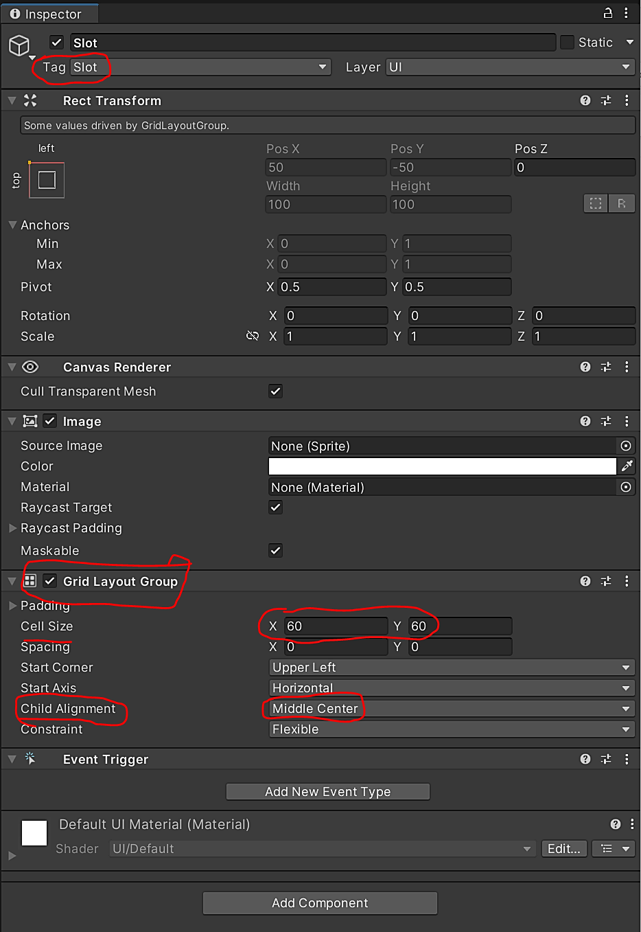 • Selecione a Image Slot e adicione um Grid Layout Group e configure conforme imagem abaixo: